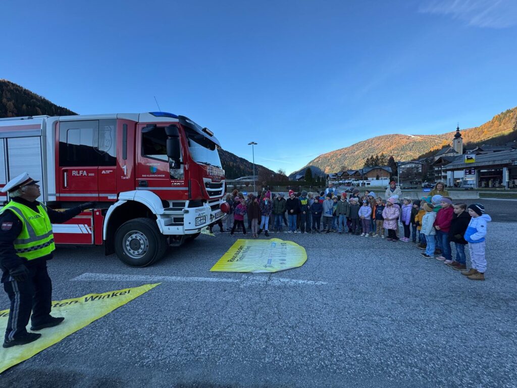 Weiters wurde den Kindern die toten Winkel eines LKWs vor Augen geführt, gemeinsam mit der Freiwilligen Feuerwehr Bad Kleinkirchheim. Kommandant Herr Ing. Michael Sappl und Herr Johann Peter Krenn waren mit einem Feuerwehrauto vor Ort und die Kinder konnten in den LKW einsteigen und so direkt erfahren, wie die Umgebung aus Sicht des Fahrers wahrgenommen wird.